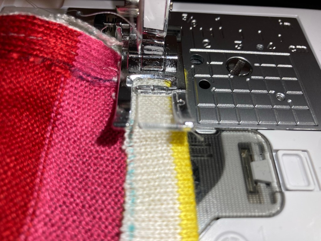 Coudre le tissu à 1cm de la couture pour tenir le surplus en place, sur toute la longueur du tissu.