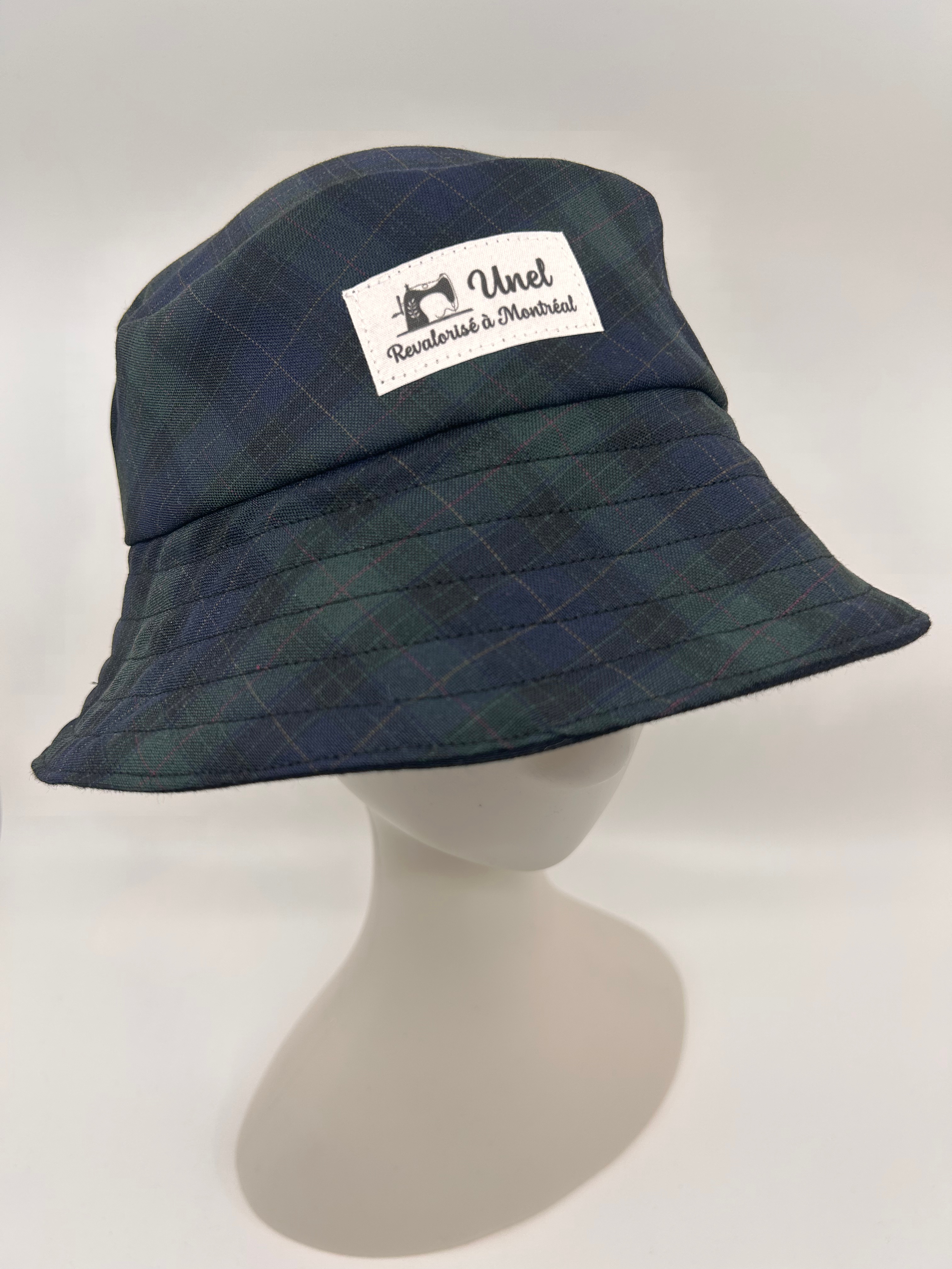 Chapeau surcyclé carreauté foncé, taille M, fait à la main à Montréal à partir de textiles récupérés. Écoresponsable, unique et confortable. Un accessoire local pour une mode durable.