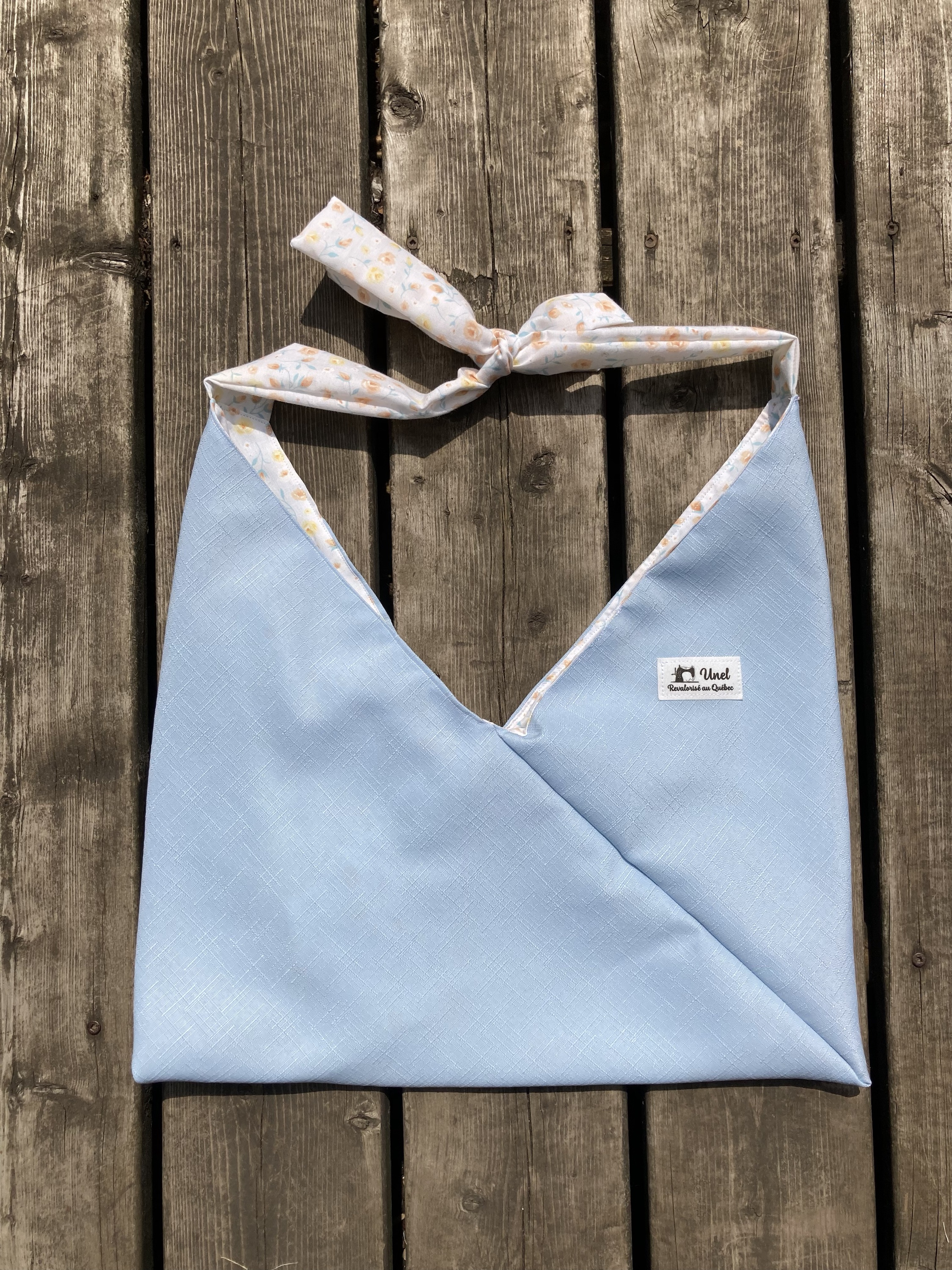 Un sac origami réversible, léger et ajustable grâce à son nœud, fabriqué à Montréal à partir de tissus recyclés. Chaque pièce est unique et écoresponsable. Celui-ci est fait à partir d’une nappe et une robe de chambre.